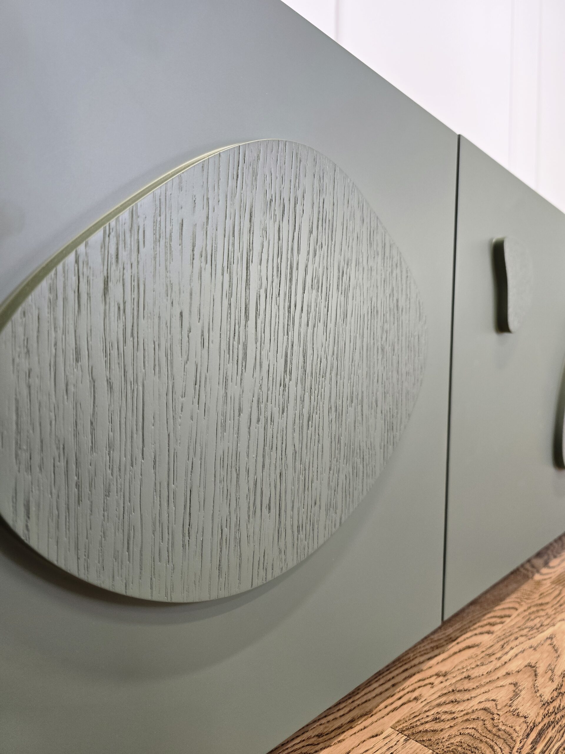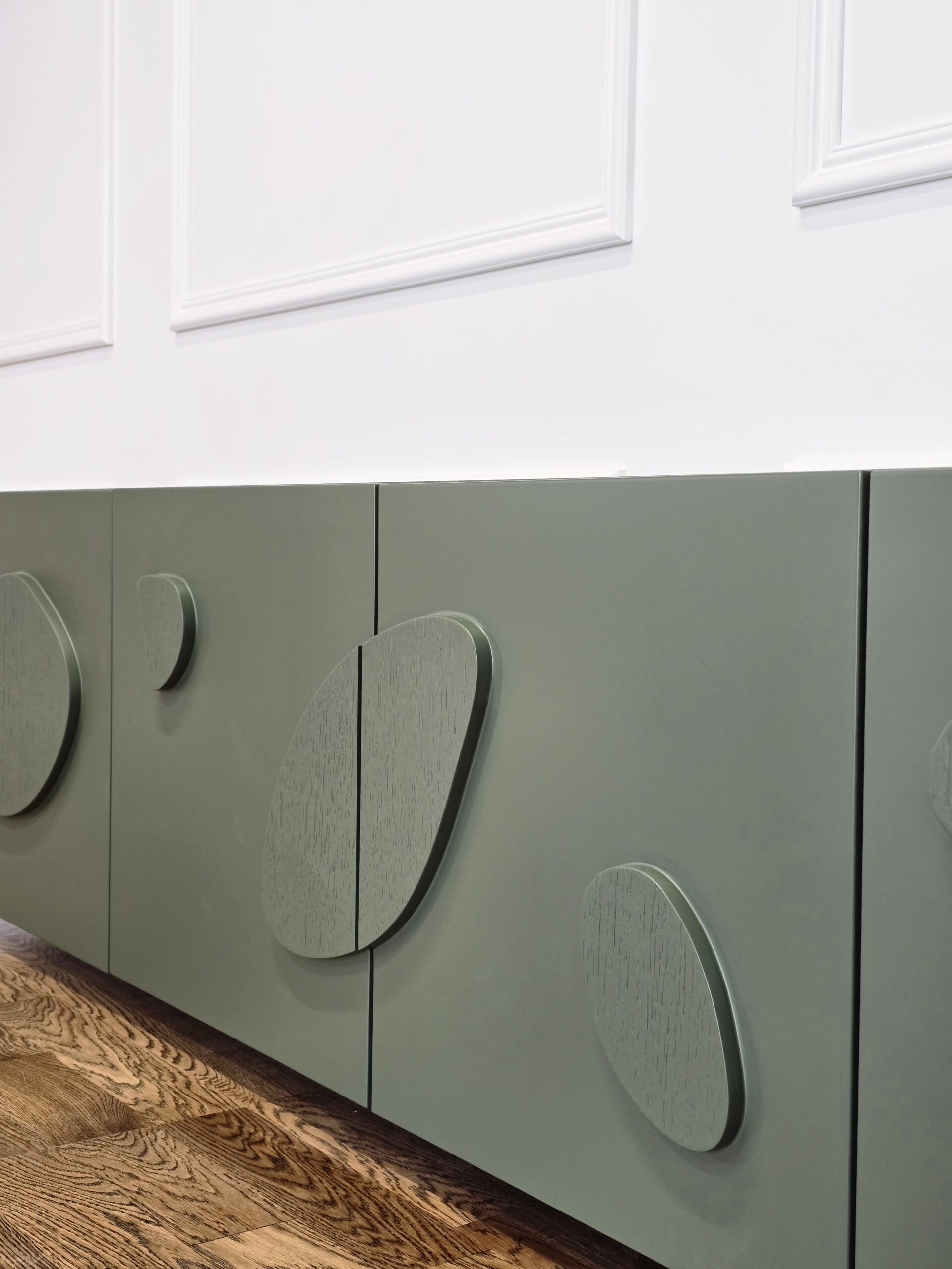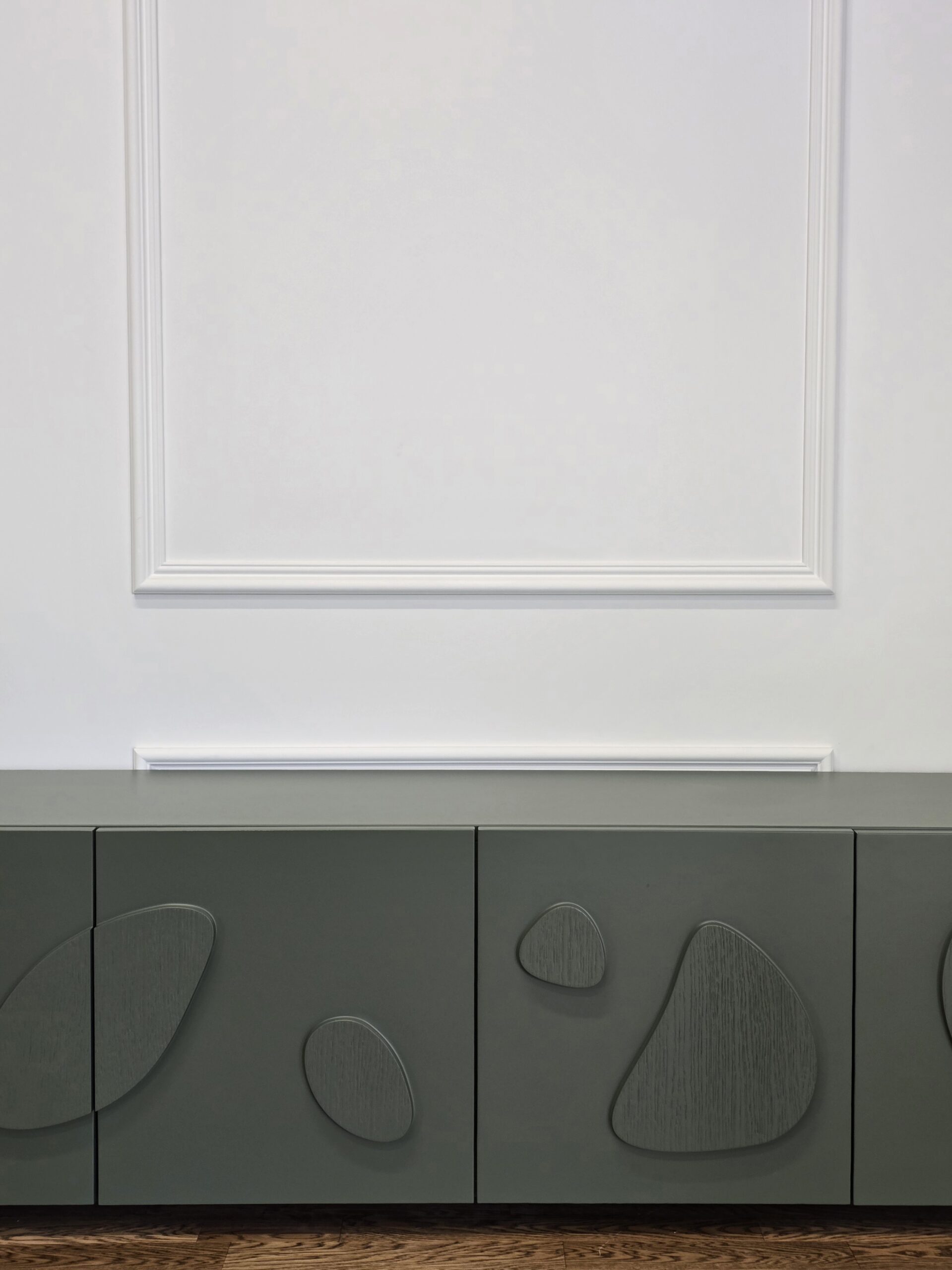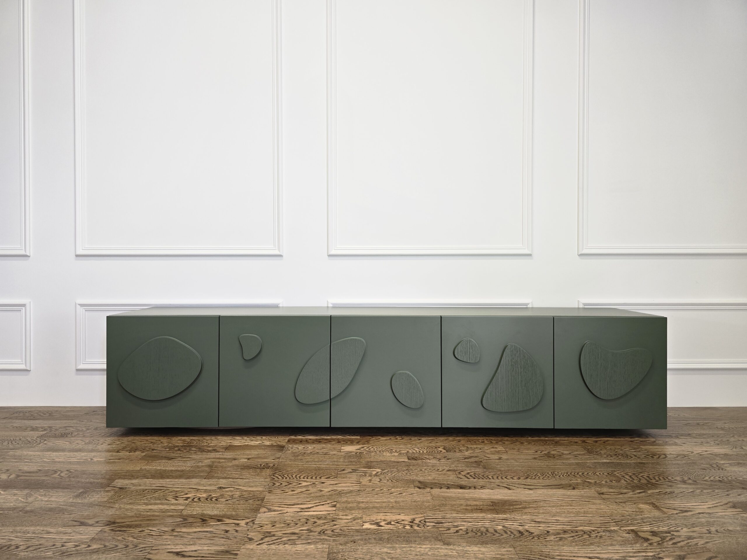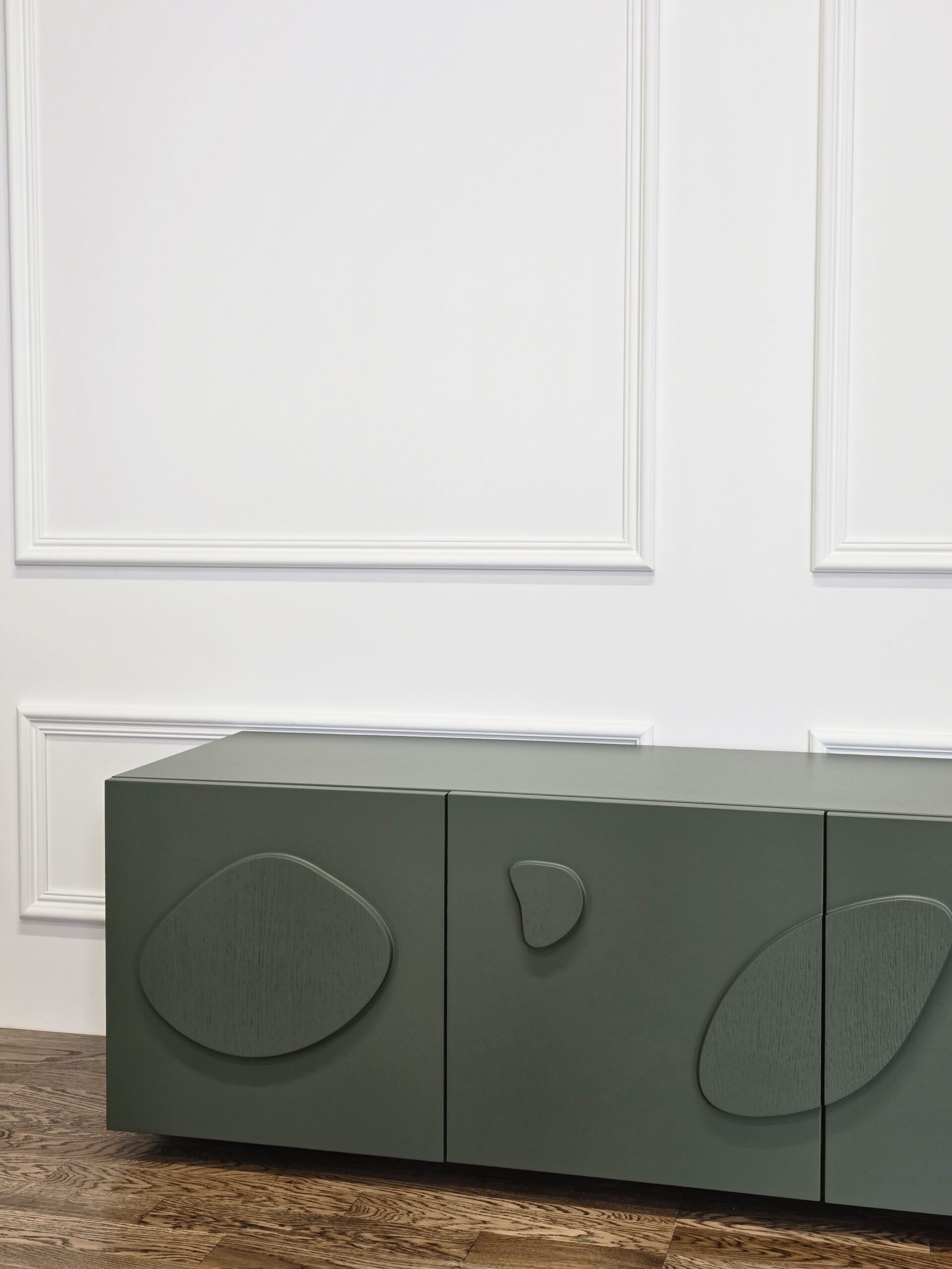Šis unikalus TV baldas išsiskiria netradiciniu dizainu – fasadas dekoruotas į reljefą įleistomis organiškomis formomis, kurios primena gamtos įkvėptus siluetus. Gili žalia spalva (NCS S6010-G30Y) suteikia baldui ramybės, solidumo ir stiliaus pojūtį, o paprasta forma leidžia dizaino detalėms kalbėti už save. Tiek modernus, tiek meninį prieskonį turintis baldas puikiai įsilieja į išskirtinius interjerus.