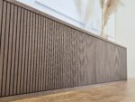 Šis TV baldas išsiskiria giliu medžio tonu ir vertikaliu fasado reljefu, kuris suteikia tekstūriškumo bei charakterio. Vizualiai lengvas, tačiau solidus baldas sukurtas šiuolaikiškam interjerui, kuriame svarbus švarus dizainas ir praktiškumas.