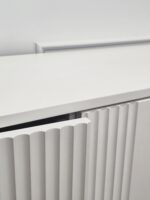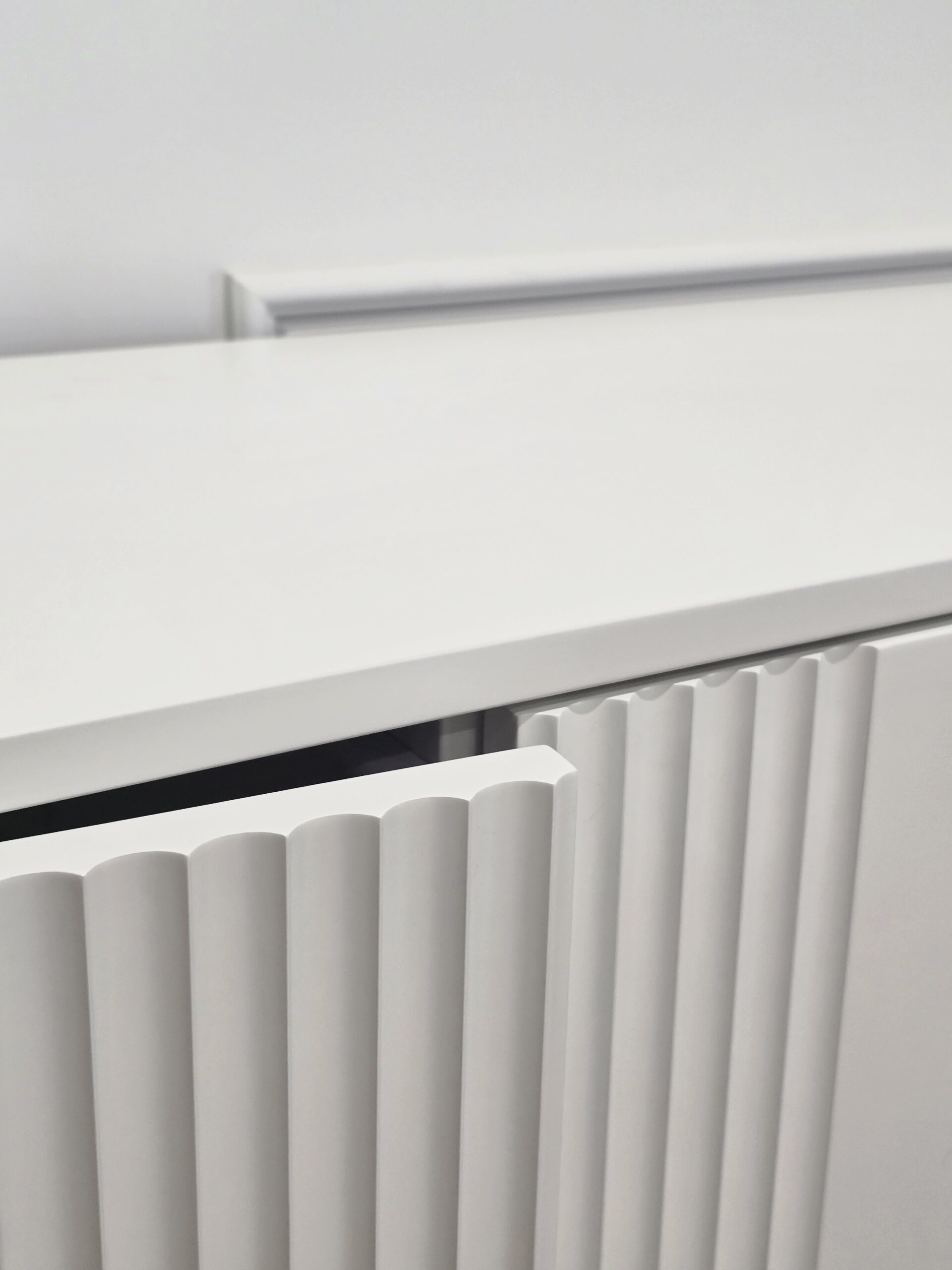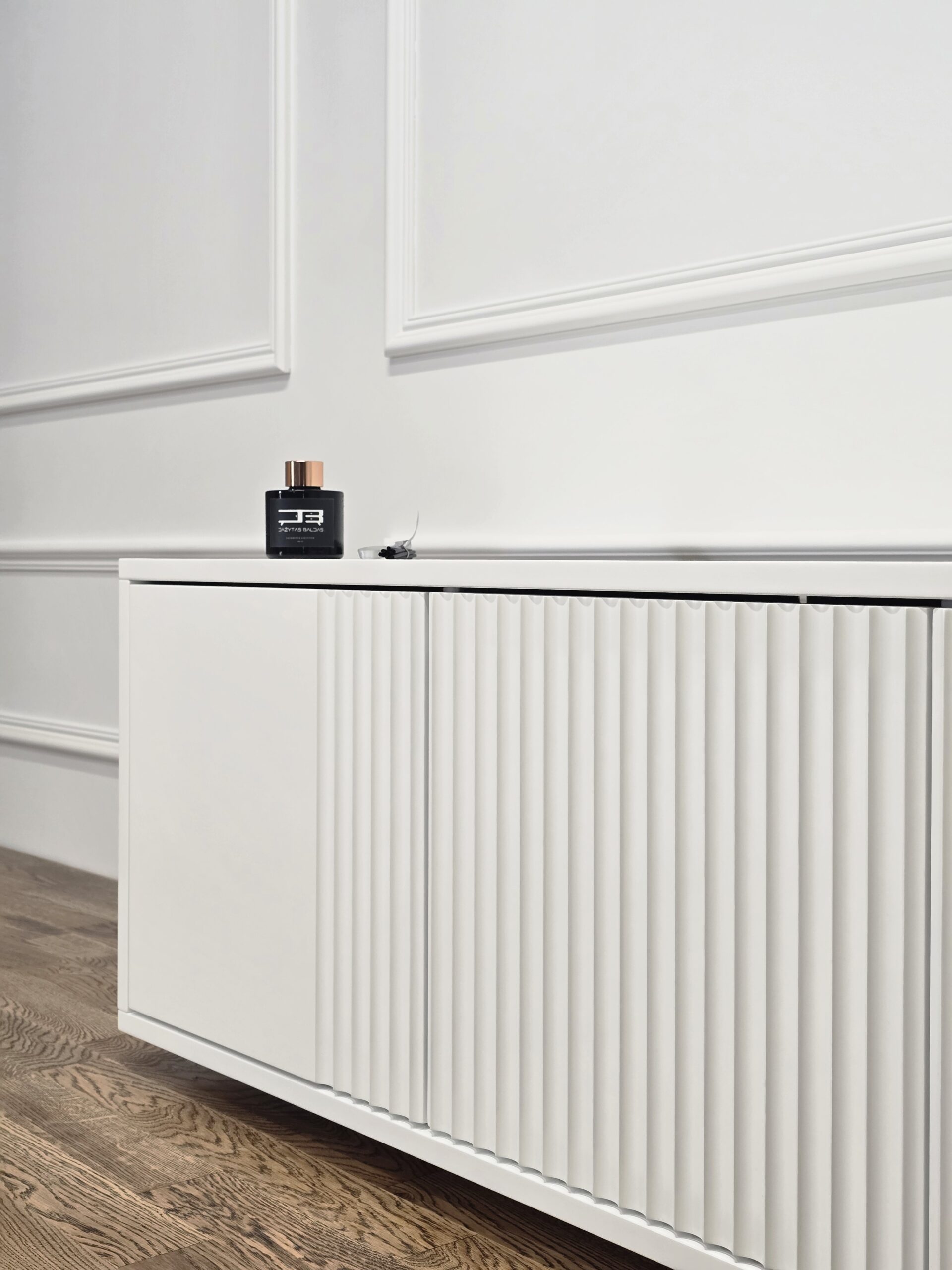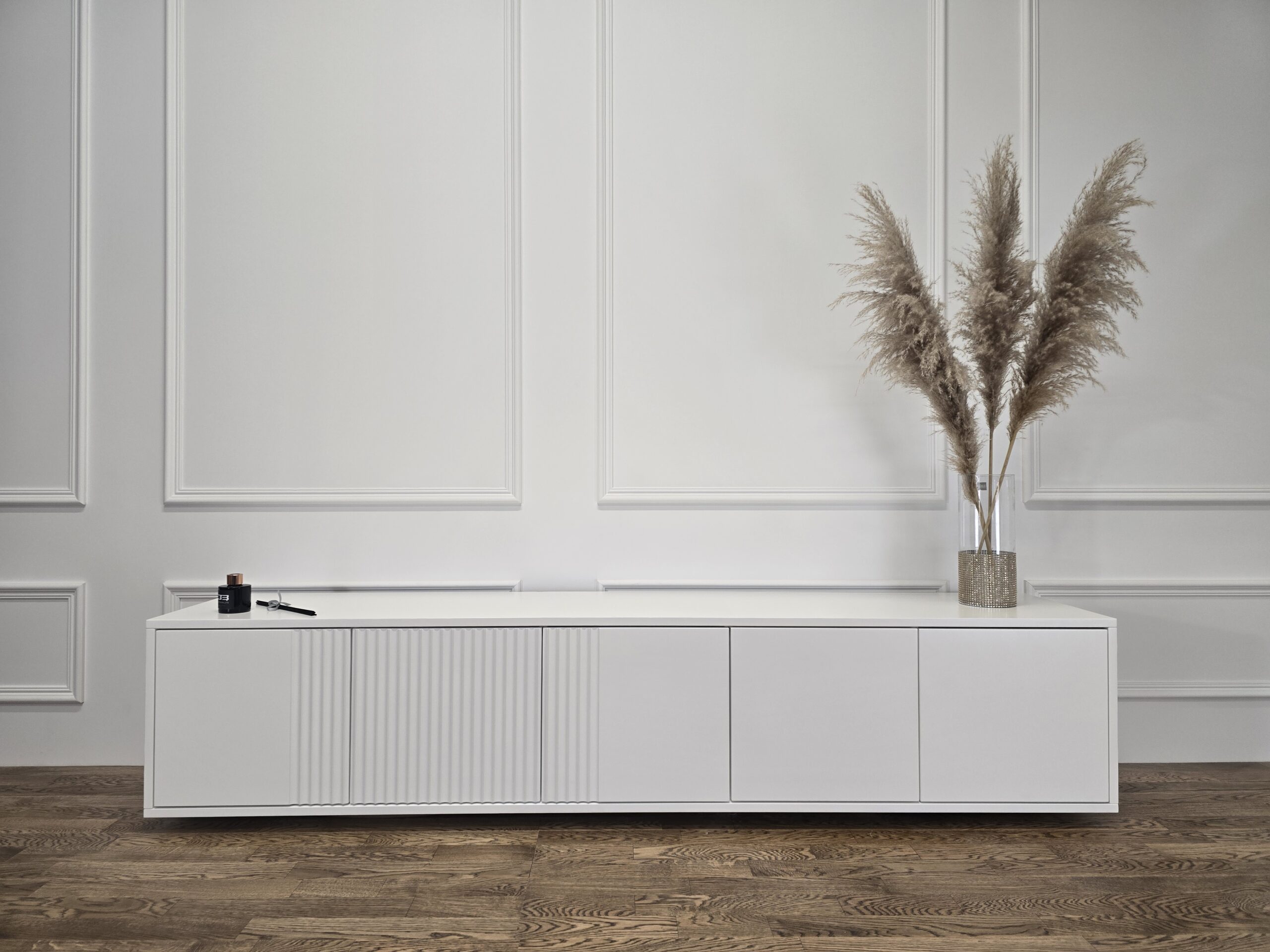 Šis pakabinamas TV baldas išsiskiria subtiliu, ritmišku fasado reljefu bei nepriekaištingai švaria forma. Be rankenėlių, baldas atrodo vientisas ir vizualiai lengvas – tai puikus sprendimas moderniam, minimalistiniam interjerui.