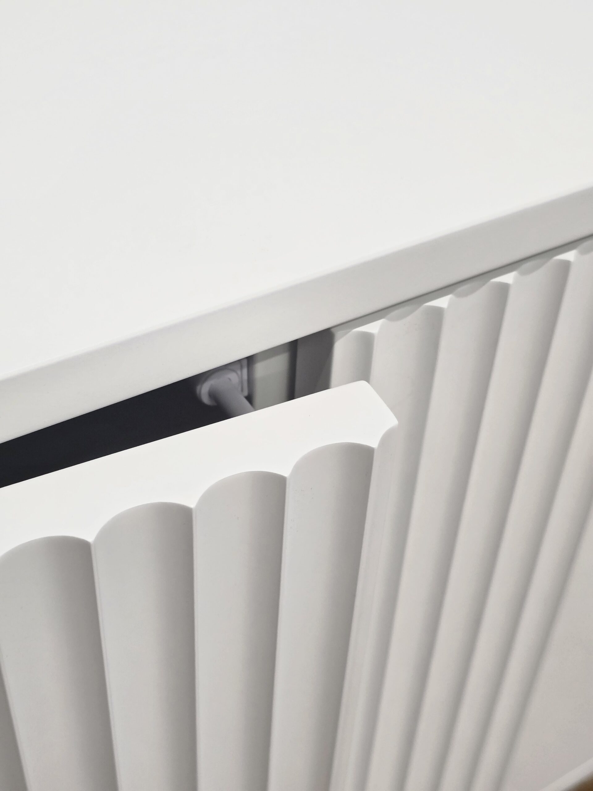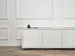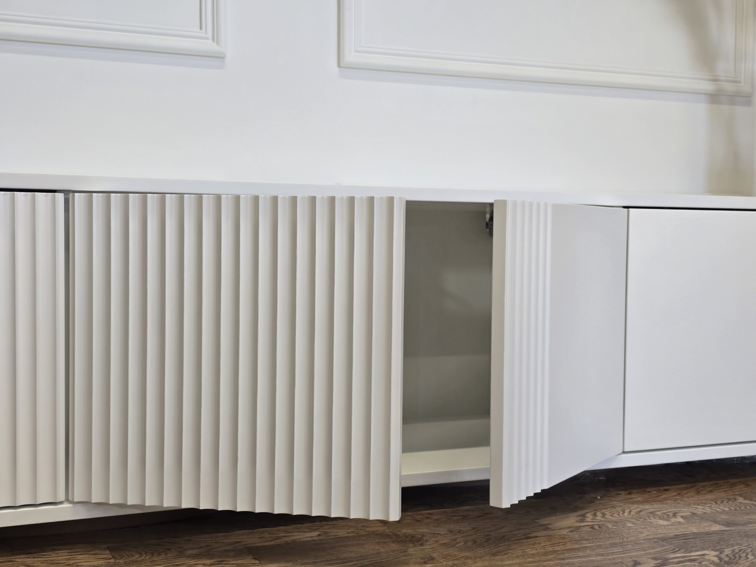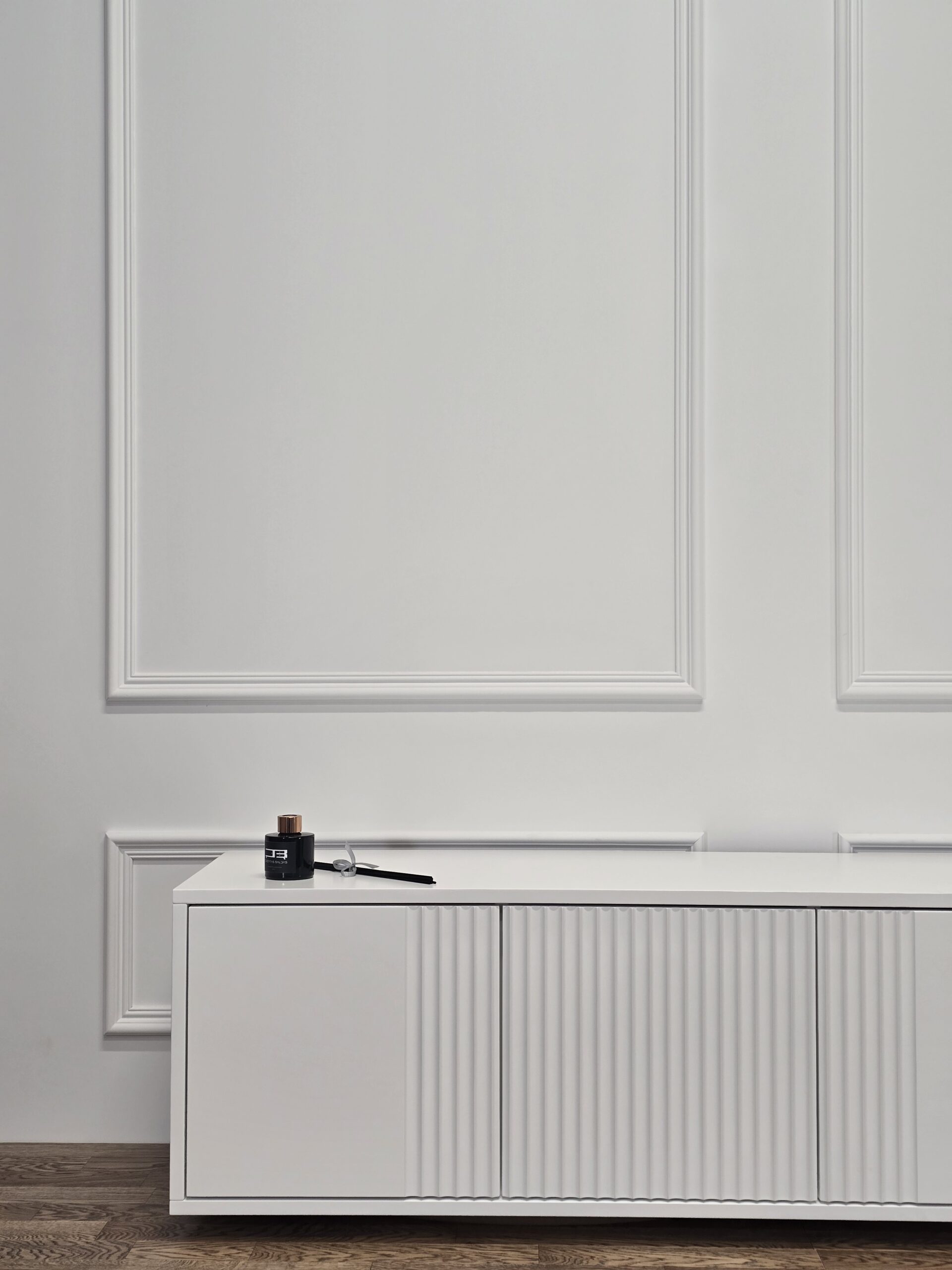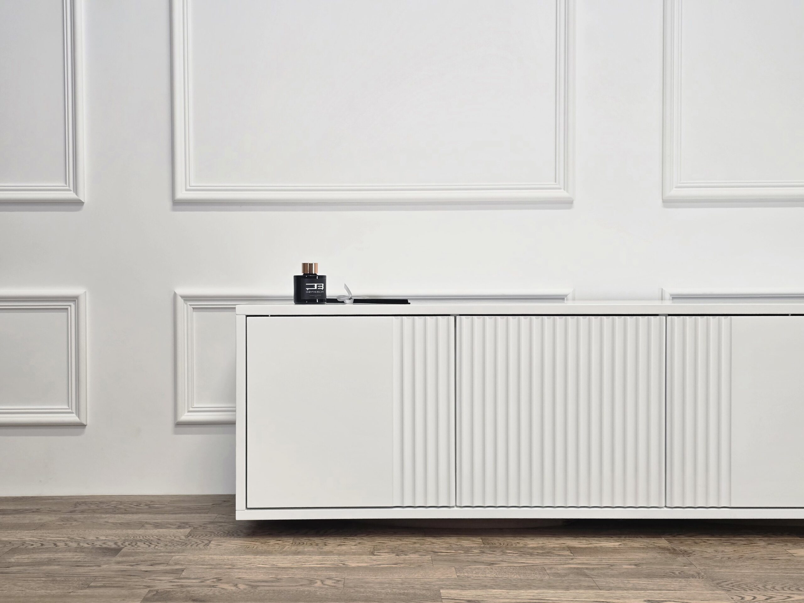 Šis pakabinamas TV baldas išsiskiria subtiliu, ritmišku fasado reljefu bei nepriekaištingai švaria forma. Be rankenėlių, baldas atrodo vientisas ir vizualiai lengvas – tai puikus sprendimas moderniam, minimalistiniam interjerui.
