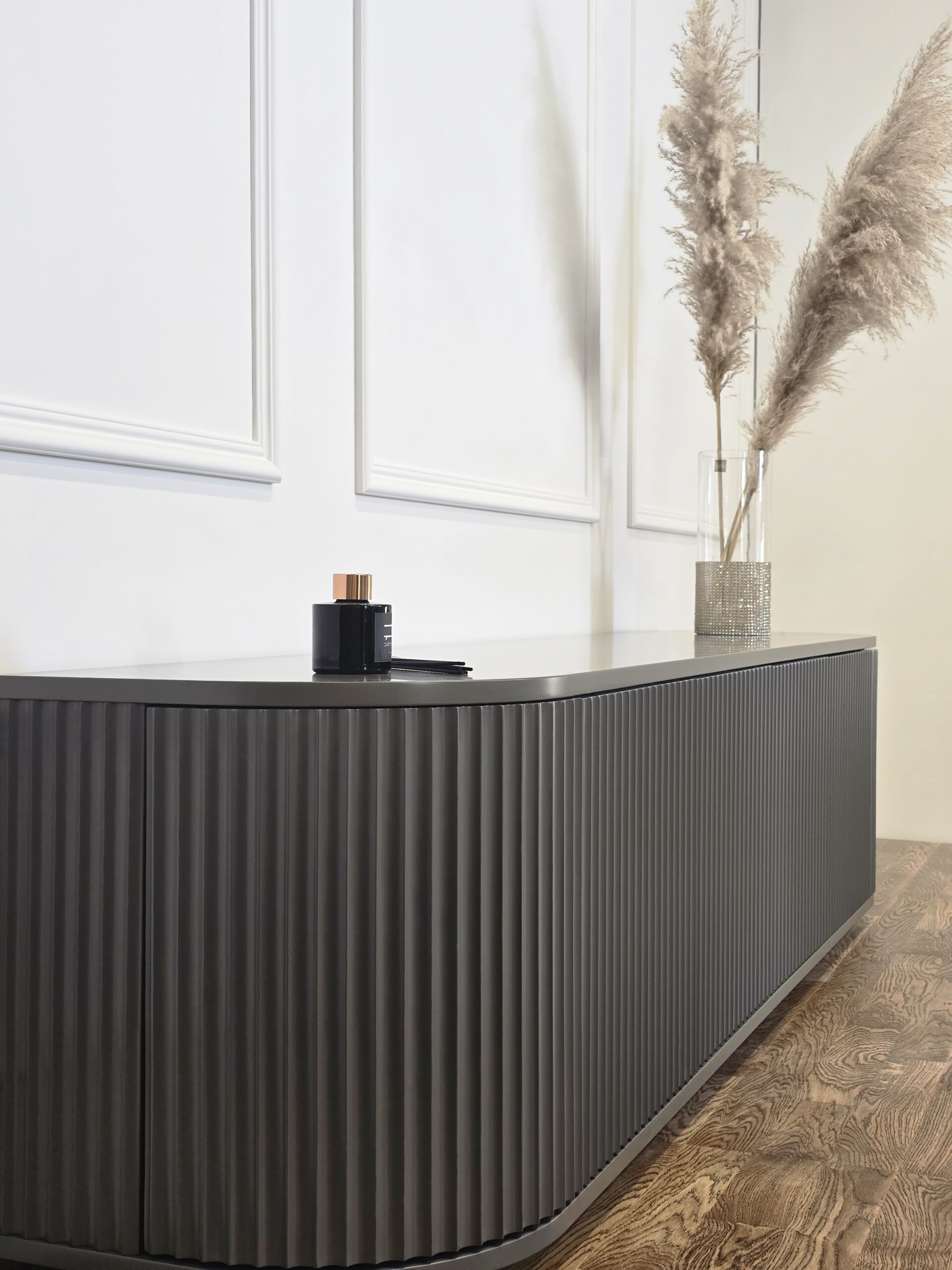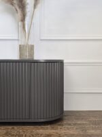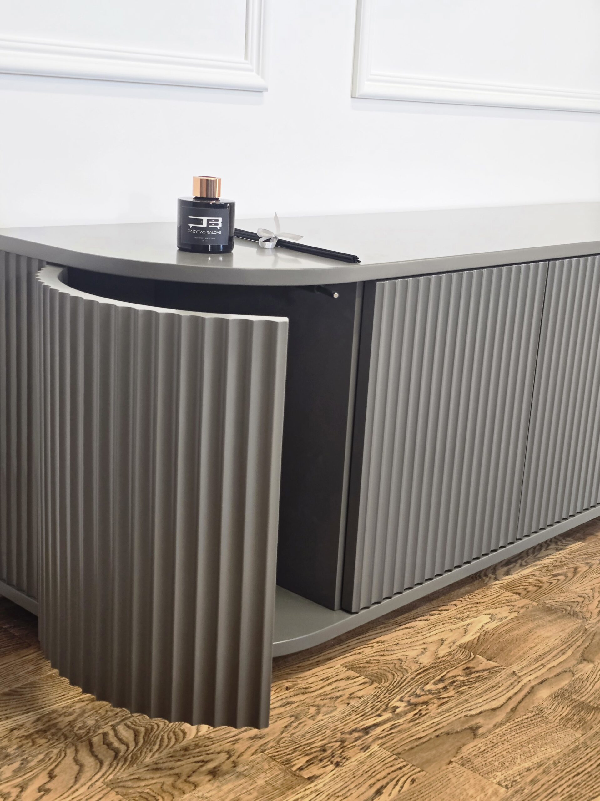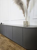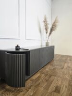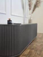 Šis pakabinamas TV baldas išsiskiria švelniai užapvalintais kampais ir vertikaliu dekoru, kuris suteikia fasadui išskirtinumo bei ritmo. Modernus, solidus dizainas puikiai tinka ieškantiems prabangos ir funkcionalumo derinio šiuolaikiniame interjere.