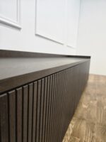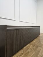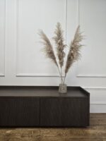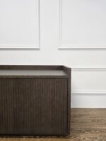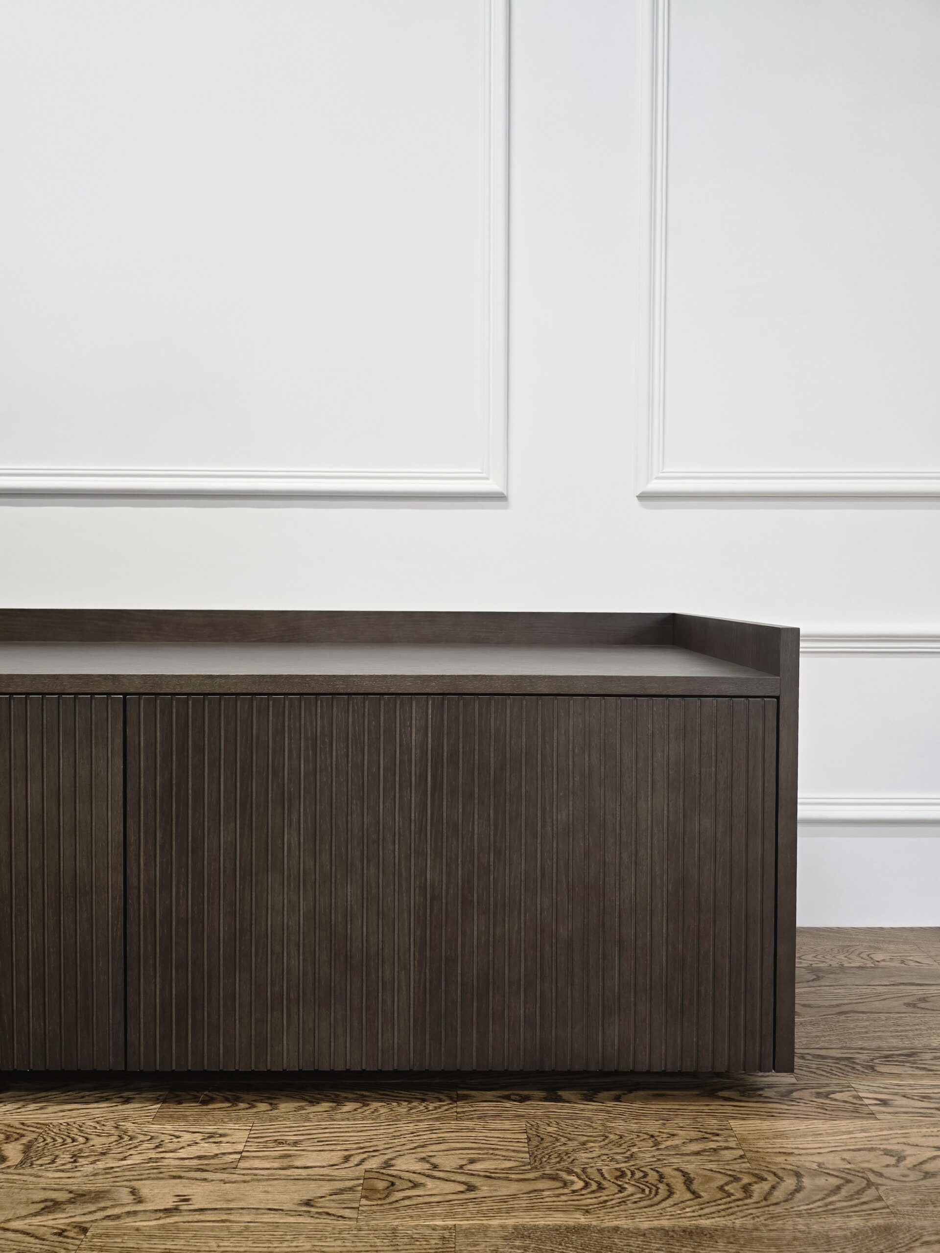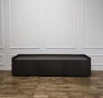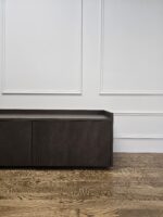 TV baldas iš tamsaus ąžuolo lukšto (spalva MCX4050) išsiskiria iškiliu apsauginiu borteliu, kuris subtiliai įrėmina viršutinį paviršių ir suteikia baldui architektūrinio išbaigtumo. Vertikalus reljefas fasade sukuria ramų ritmą, o minimalistinės formos užtikrina, kad baldas derės tiek klasikiniame, tiek moderniame interjere.