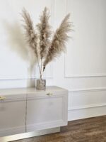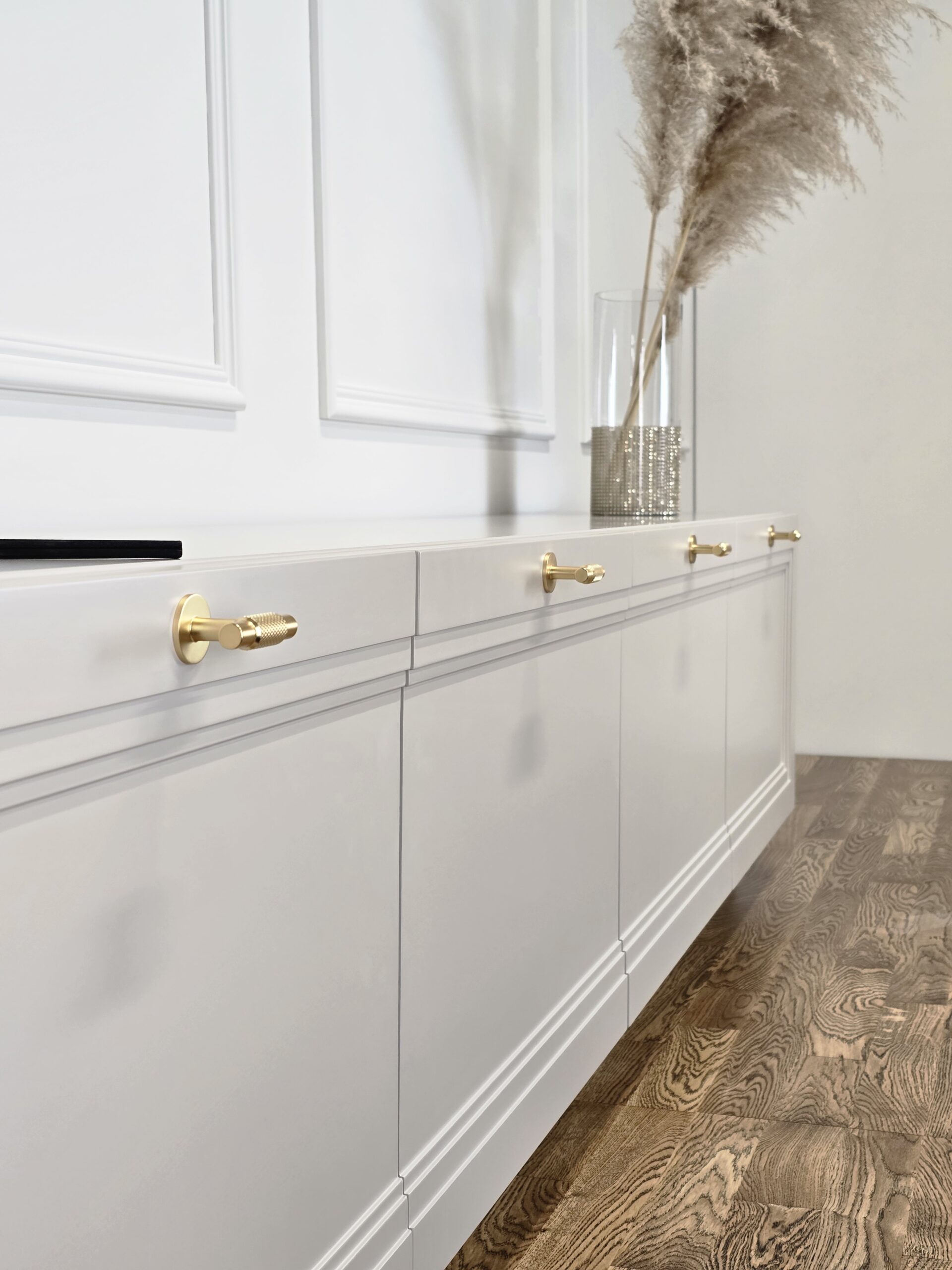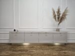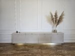 Šis elegantiškas TV baldas su aiškiai išreikštomis klasikinių formų linijomis bei auksinėmis rankenėlėmis sujungia tradicinį stilių su šiuolaikine estetika. Blizgus auksinis pagrindas suteikia vizualinio lengvumo ir pakelia baldą virš grindų lygio, išryškindamas jo solidumą. Fasado plokštumose subtiliai išfrezuotos detalės kuria harmoningą struktūrą.