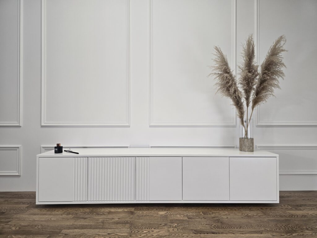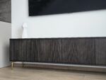 Šis TV baldas išsiskiria prabanga alsuojančiu tamsiu medžio lukštu (spalva MCO6045) ir išraiškingu vertikaliu reljefu. Kontrastingos auksinės kojelės suteikia baldui išskirtinumo ir rafinuoto žavesio. Dėl subalansuotos proporcijos bei švarių linijų baldas atrodo solidžiai, bet tuo pačiu lengvai įsilieja į erdvę.